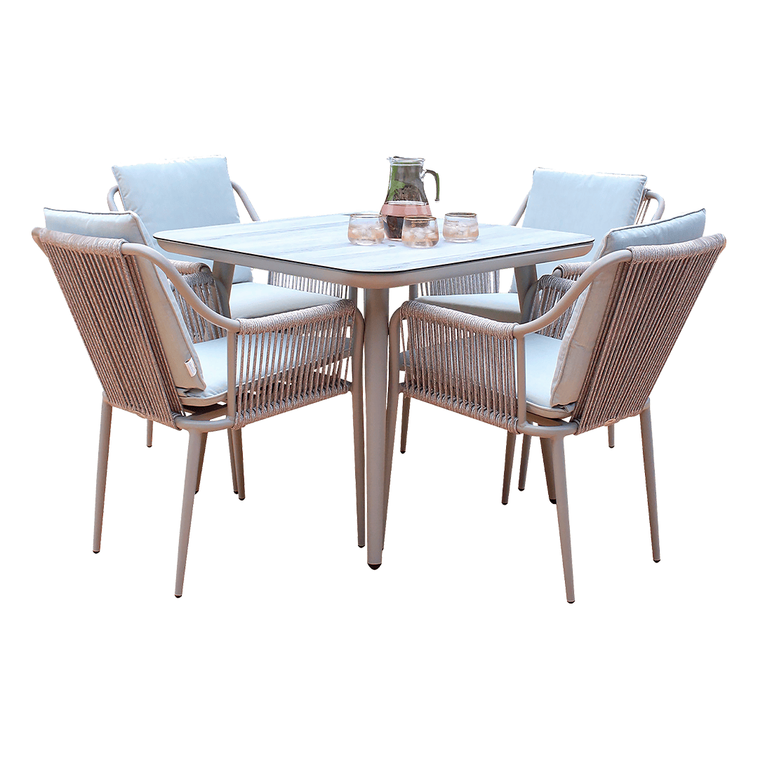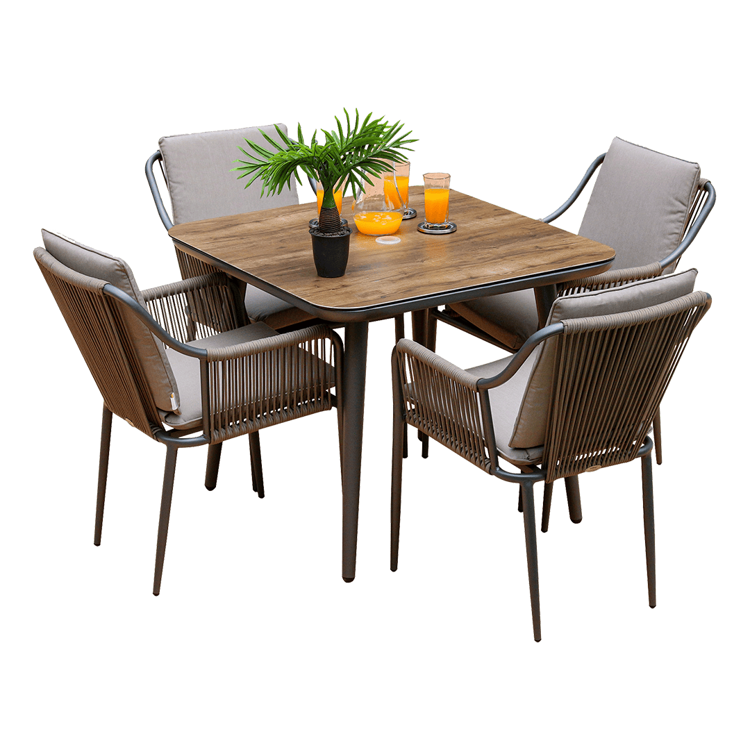 Funcional, elegante y resistente. El comedor Amalfi Cuadrado 4 Ptos en colores gris o taupe es ideal para disfrutar momentos al aire libre con estilo y comodidad en espacios exteriores.